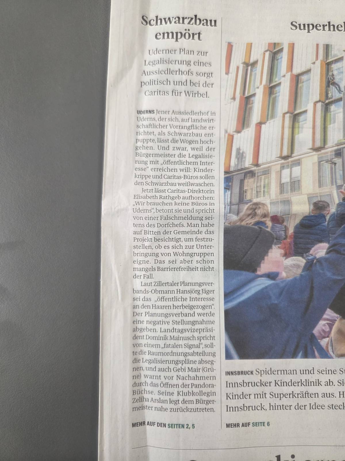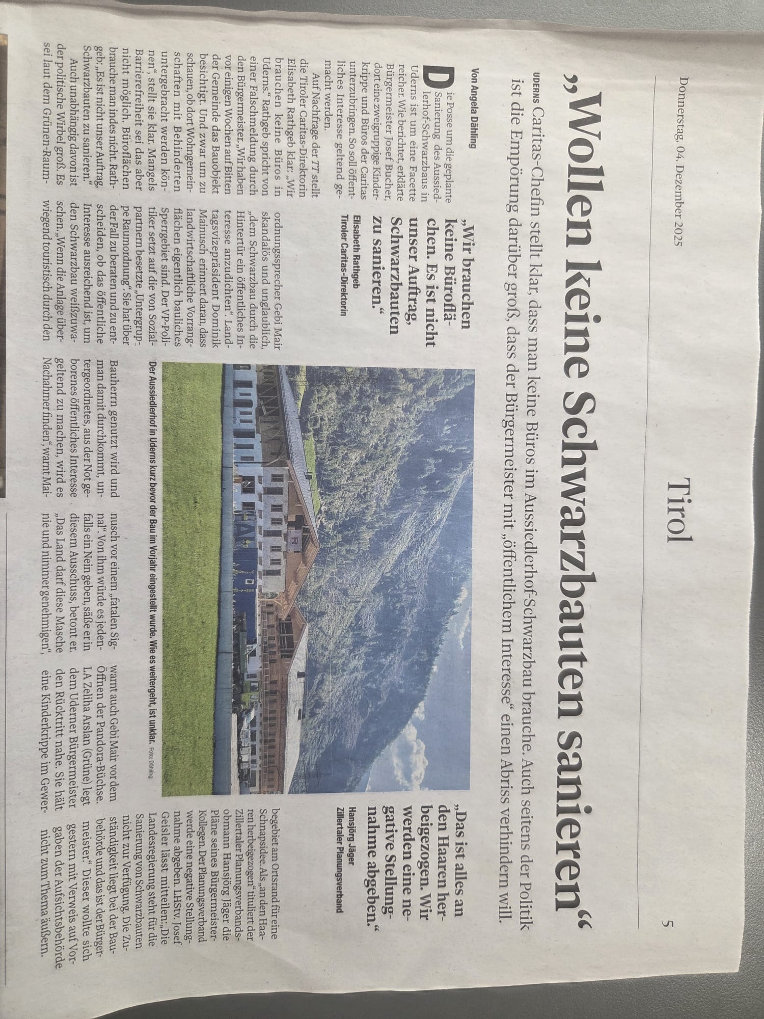 Uderner Plan zur Legalisierung eines Aussiedlerhofs sorgt politisch und bei der Caritas für Wirbel... [Pressebericht TT]